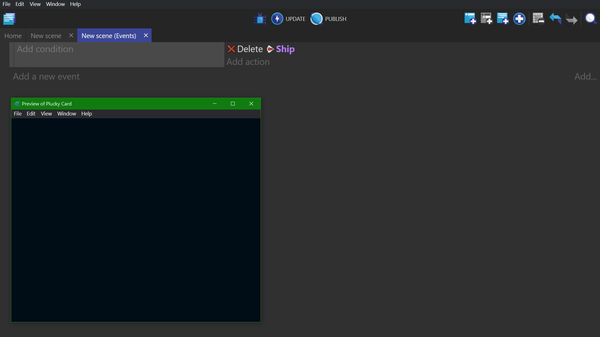 - In the bottom example, the first event deletes all the "Ship" objects from the scene/screen. It then creates one "Ship" at the coordinates X: 100, Y: 200 (100;200) on the base layer. This pair of events will display a single ship on the screen. (Behind the scenes, the ship is being deleted and recreated on every frame, which is not something you would want to do in a real game.)