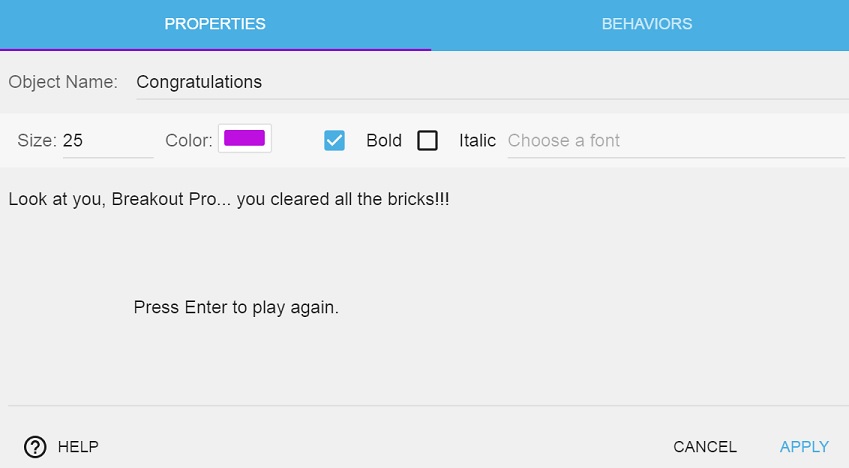 - In the Text field, type a congratulatory message (e.g. Congratulations! You cleared all the blocks!). Also include a line telling the player "Press Enter to play again."