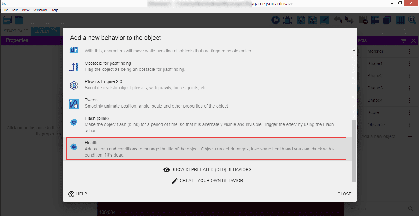 This introduces a behavior called "Health", which we can then manipulate in our game to manage the life of an object. Click "Install in project" to be able to use it.