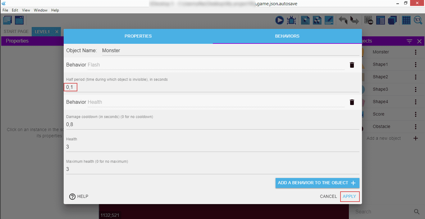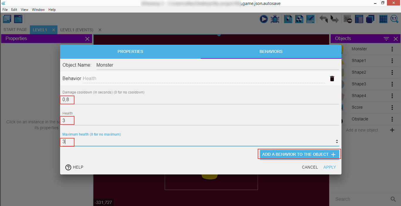 Click on the "Level1" to go back to the scene editor, then in the right panel with the "Objects" double click on the "Monster" - it will open a popup.