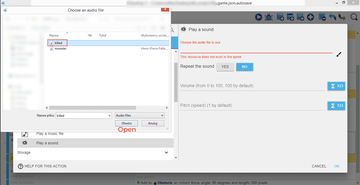 From within "Other actions" we're going to add a different sound when that happens. "Audio", "Play a sound", "Choose a new audio file" to open the file explorer window.