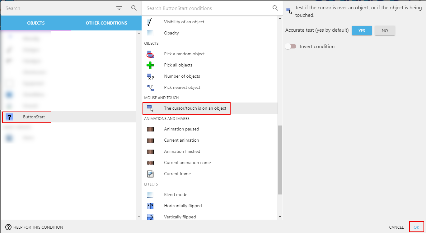 Add a new condition: "Other conditions", then "The cursor/touch is on an object", and assign this to "ButtonStart". Don't forget to select "Invert condition" to make this work as we want it.