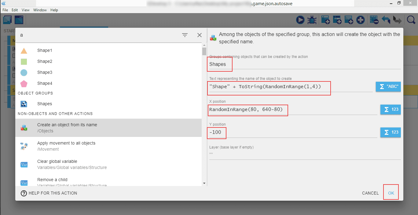 The three values we will enter are: "Text representing the name of the object to create", "X position", and "Y position". Name it "Shape" + ToString(RandomInRange(1,4))