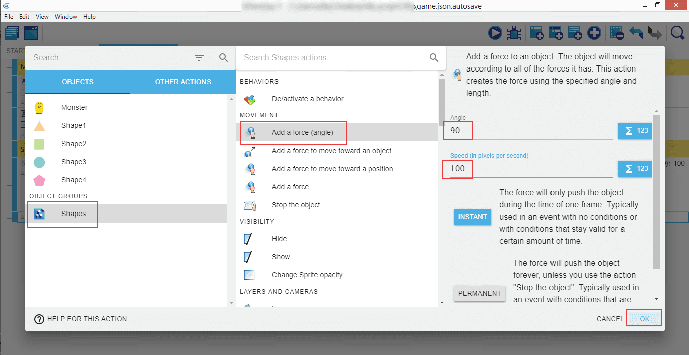Add an action: select "Shapes", then "Add a force (angle)", and set the "Angle" to 90