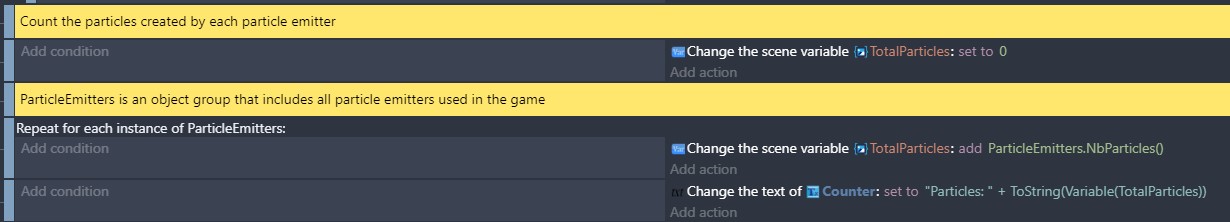 To count the number of particles used in a game, create an object group that contains all particle emitters. Then use a ForEach event to count the particles made by every particle emitter instance and save that number in a variable. Then use a text object to display that number on the screen.