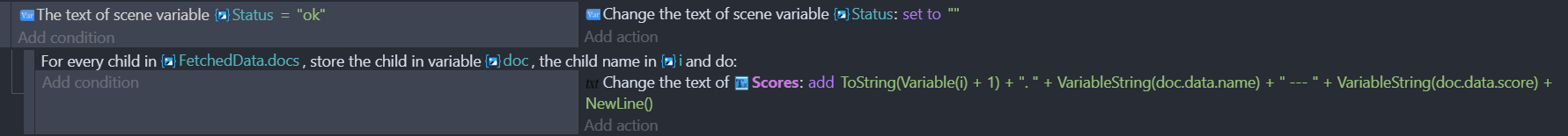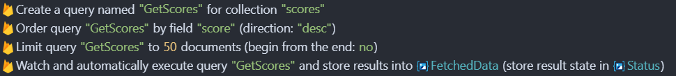 It will trigger once Firebase marked the operation as complete by putting "ok" inside the status variable, and we will set it back to 0. This last step is done to trigger the event once each time Firebase finishes fetching new scores, to allow processing the realtime updates.