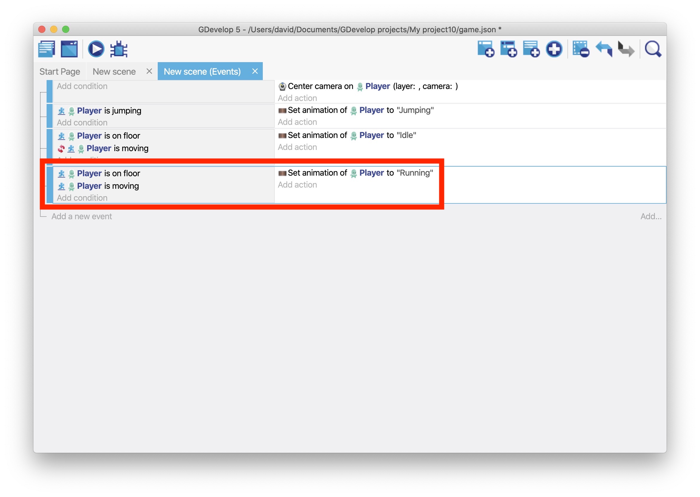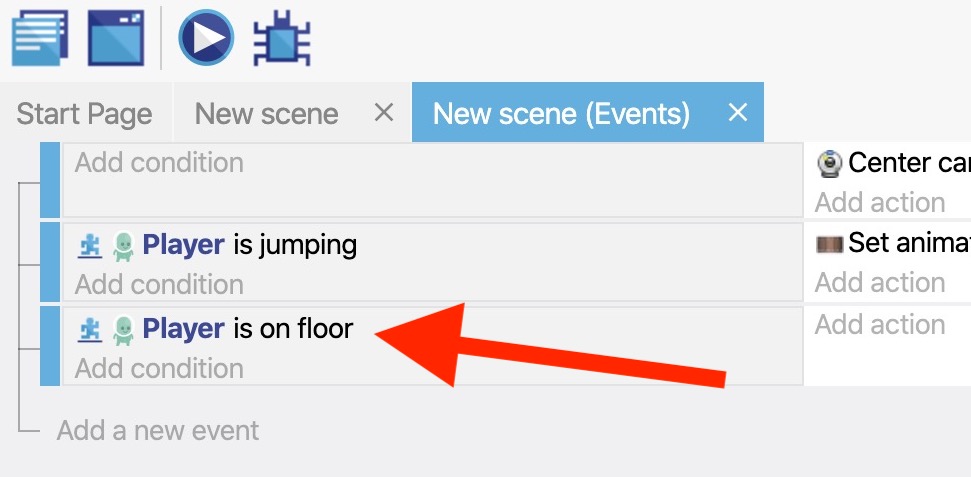 - Add the Is on floor condition to the "Player" object.