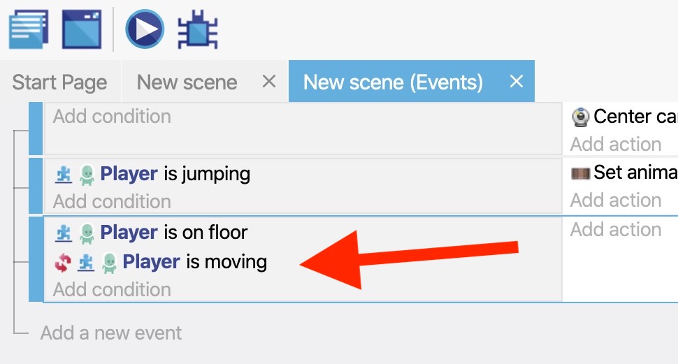 - Add the Is moving condition to the "Player" object.