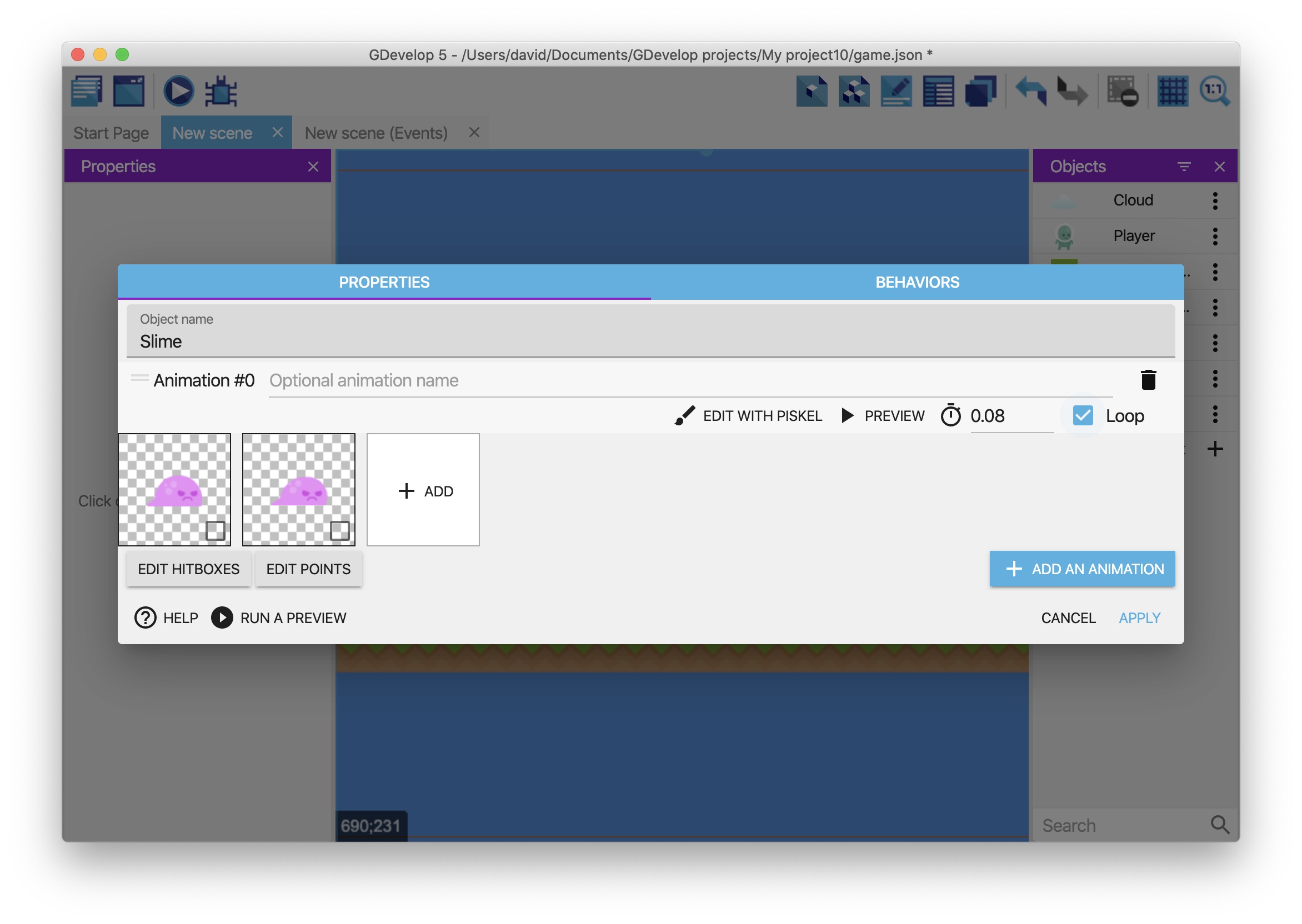 - Add a Collision condition that checks if the "Slime" object is colliding with the "Left" object.