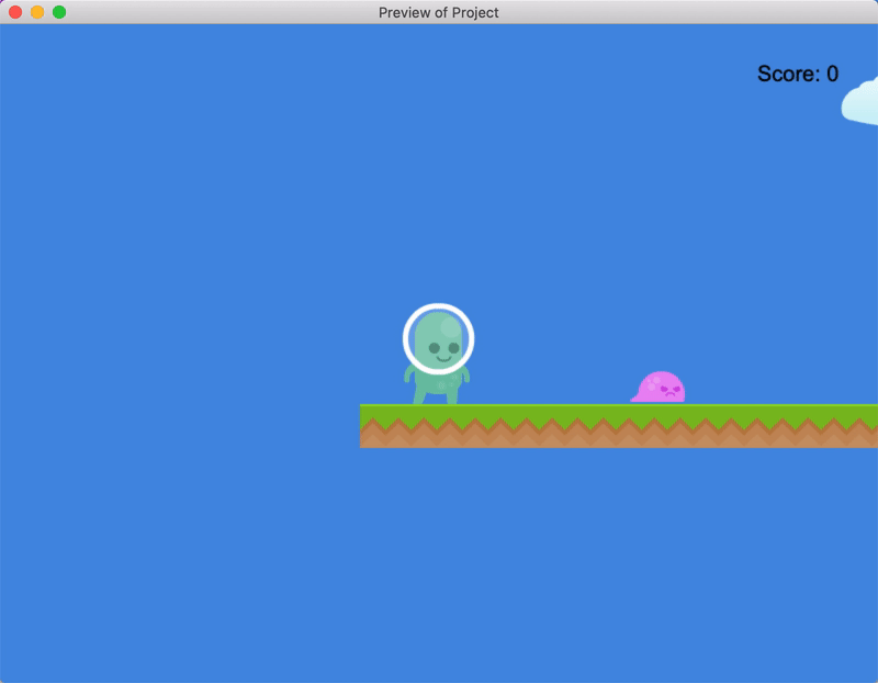 Based on this event, while the value of the "direction" variable is "right", the "Slime" object moves right. Because the object never changes direction though, it inevitably falls off the edge of the platform.