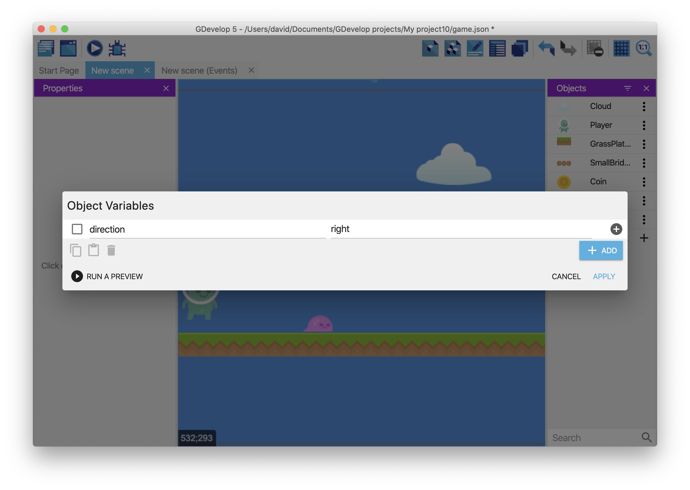 - Add a variable named "direction" with a value of "right". This is the default value of the variable.