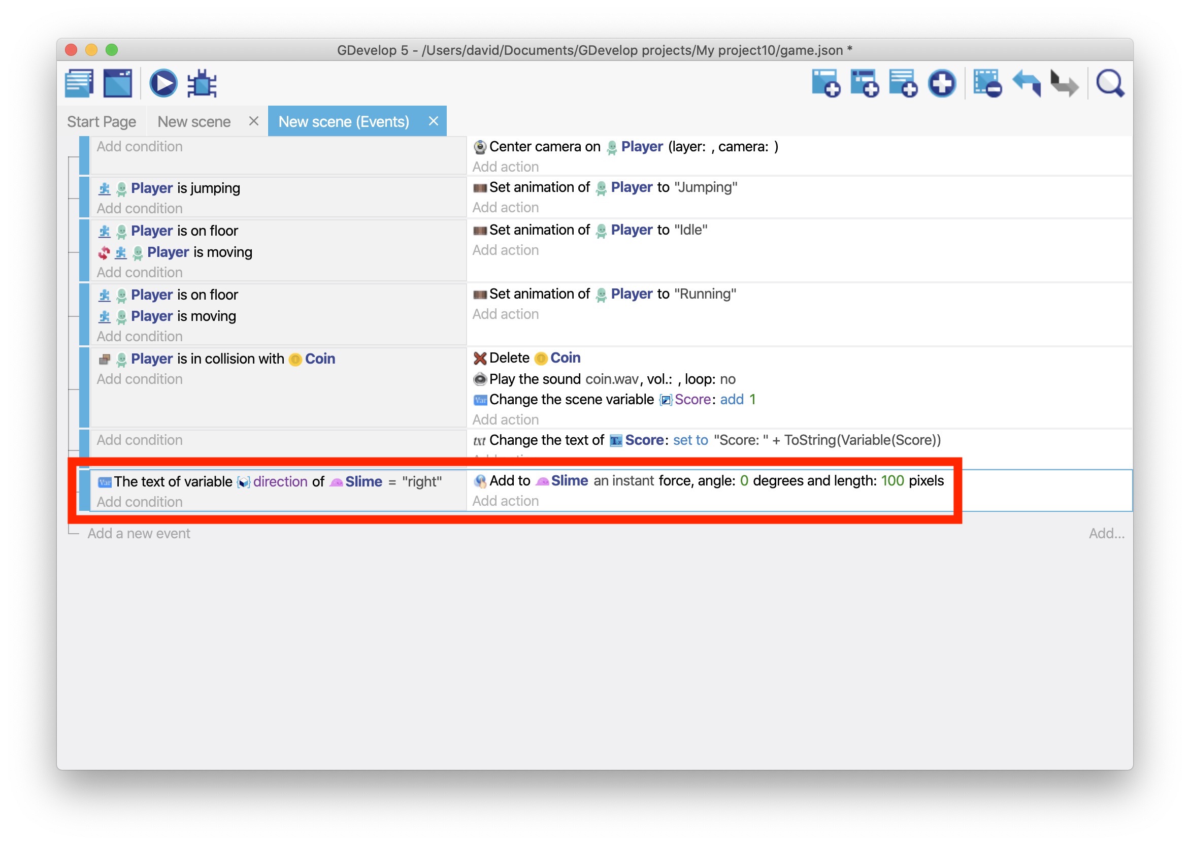 - When the "Player" object collides with the "Slime" object, set the "direction" variable to "right".