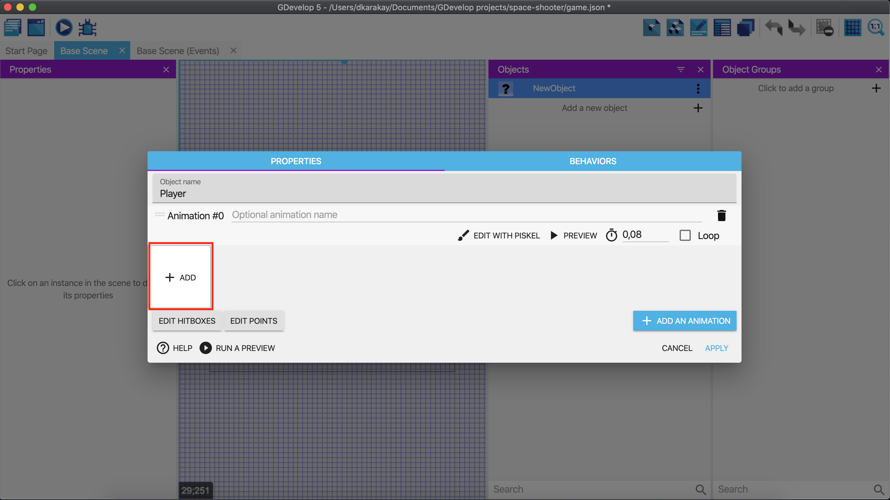 We are ready to add our player (space ship). After downloading the assets from here, we will click the "Add a new object" button.