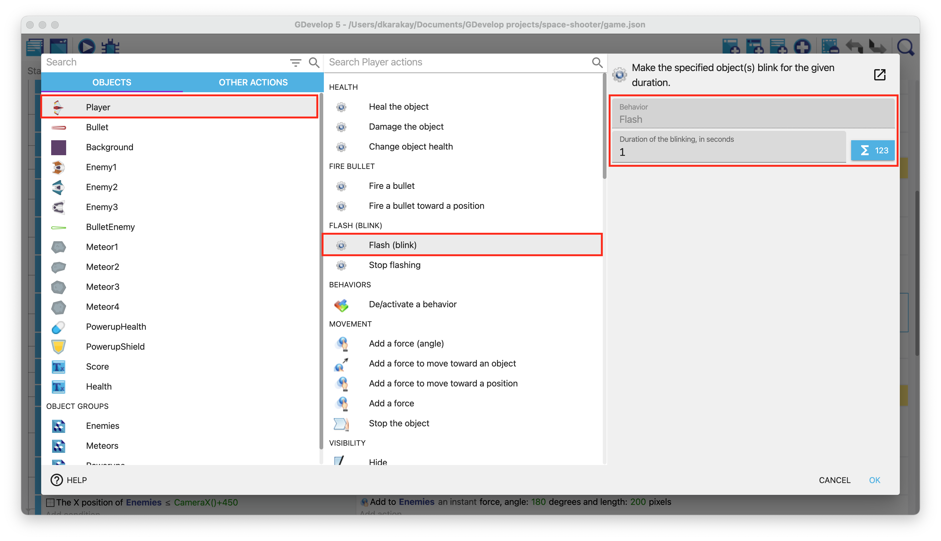 We will use a blinking effect for the player when the player gets damaged. In GDevelop, there is a behavior for blinking, so go to the player's behavior settings. Then search "blink" to install the action called Flash.