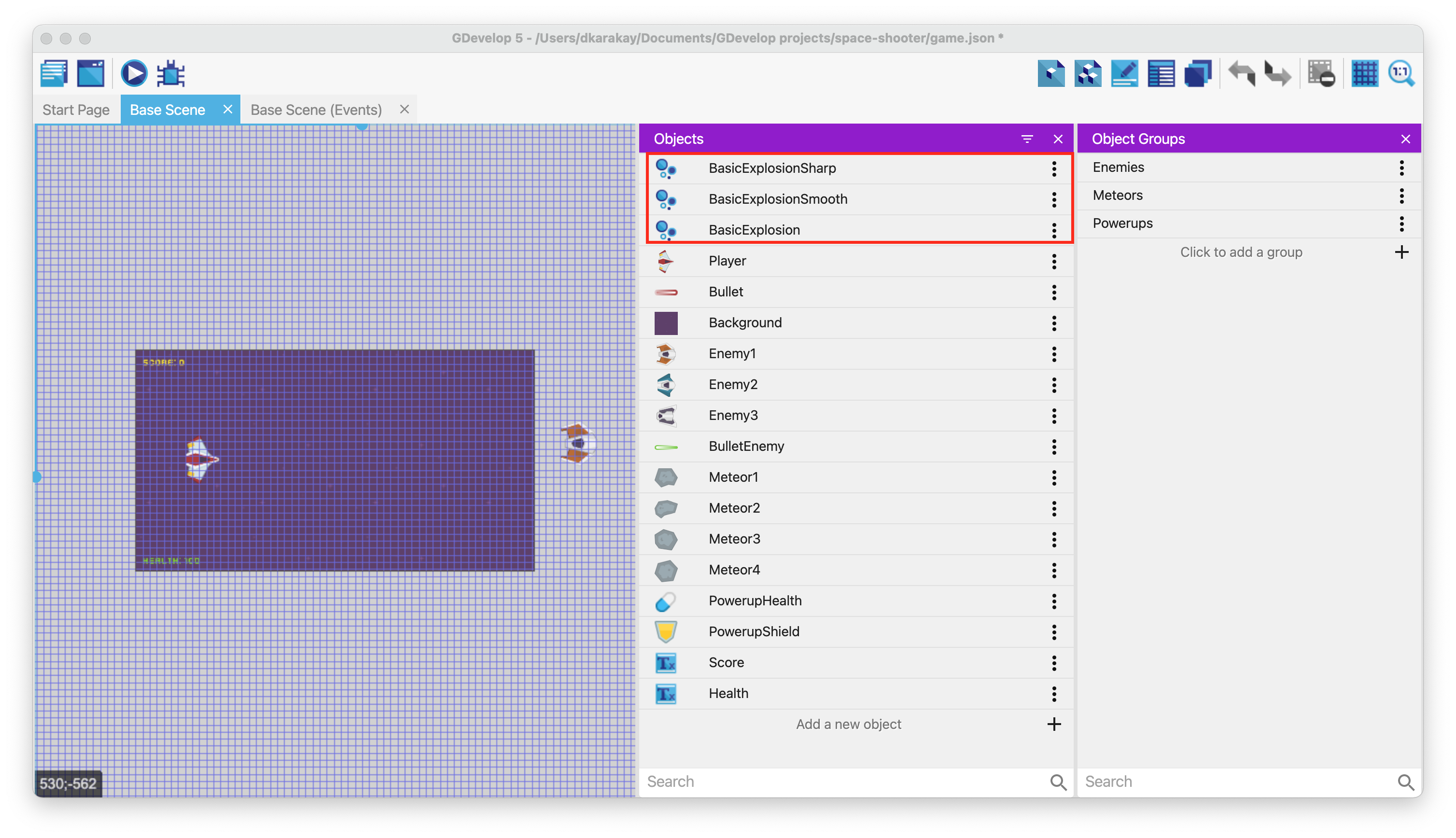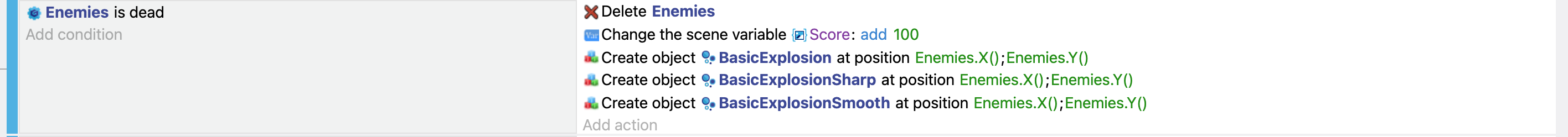 Add a new action to create these explosion objects. Select BasicExplosionSharp and choose create an object. Fill X position with Enemies.X() and Y position with Enemies.Y().