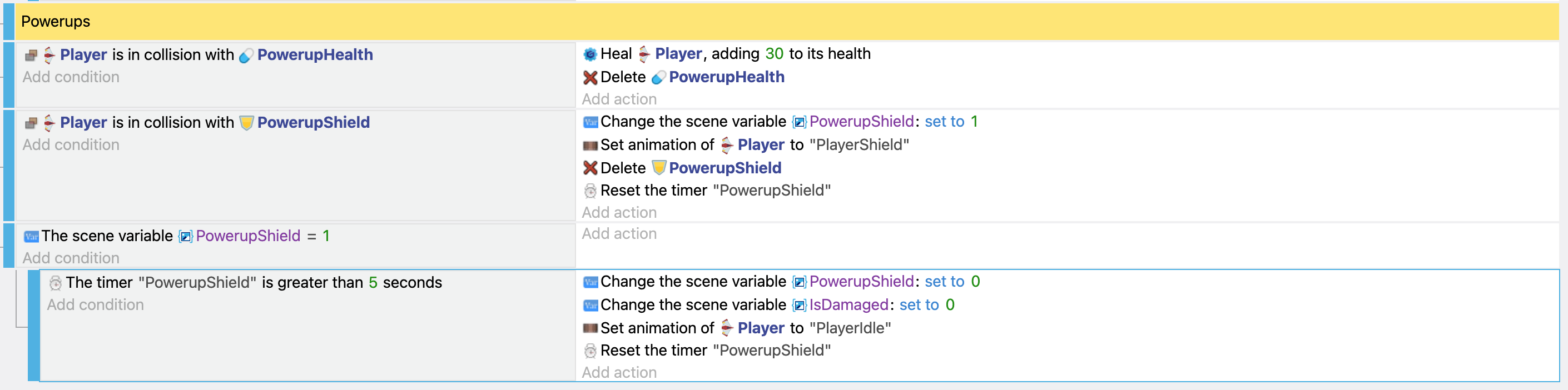 Finally, we are going to set "PowerupShield" and "IsDamaged" variables to 0 and change the animation of the player to "PlayerIdle." We also need to reset the timer called "PowerupShield." In the end, your events should look like this: