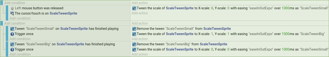 Tween は連続再生できるため、組み合わせることでより複雑なアニメーションにもできます。これを「チェイニング」(連鎖法)と呼びます。 次の図では、スプライトがマウスでクリックされると「スケールを Tween」アニメーションを再生して縮小するようにしています。 Tween が終了すると、スケールを戻すための新しい Tween アニメーションを開始します。 これはループを形成するため、スプライトがずっと脈動し続けます。これを応用することで、上下動するプラットフォームや巡回パトロールする敵などを作成できます。