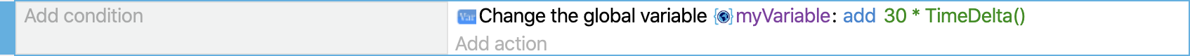 このアクションは毎フレームごとに変数をインクリメントします。もしゲームが秒間 60 フレームで実行されていたら、10 秒後の変数値は 18,000 になるでしょう。一方、もしゲームが秒間 25 フレームで実行されていたら、10 秒後の変数値は 7,500 になります。この非一貫性は、ゲームプレイ体験に重大な問題を引き起こしかねません。