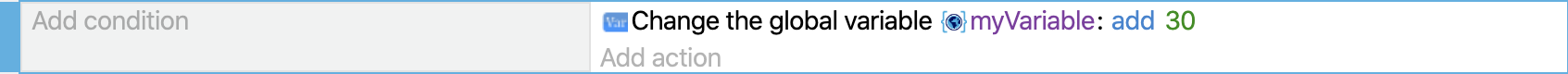 アクションは条件が真のときに発生する何かです。たとえばオブジェクトを削除するとか、変数の値を増分するとか、そういうことです。アクションがなければ、そのイベントは何もしません。