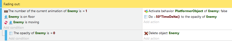 一つのイベントには複数の条件と複数のアクションを追加できます。たとえば、あるイベントの条件でプレイヤーがジャンプ中かどうかと、_かつ_敵オブジェクトと衝突しているかどうかをチェックできます。そしてアクションで敵オブジェクトを削除し、_なおかつ_スコアを増やすことができます。