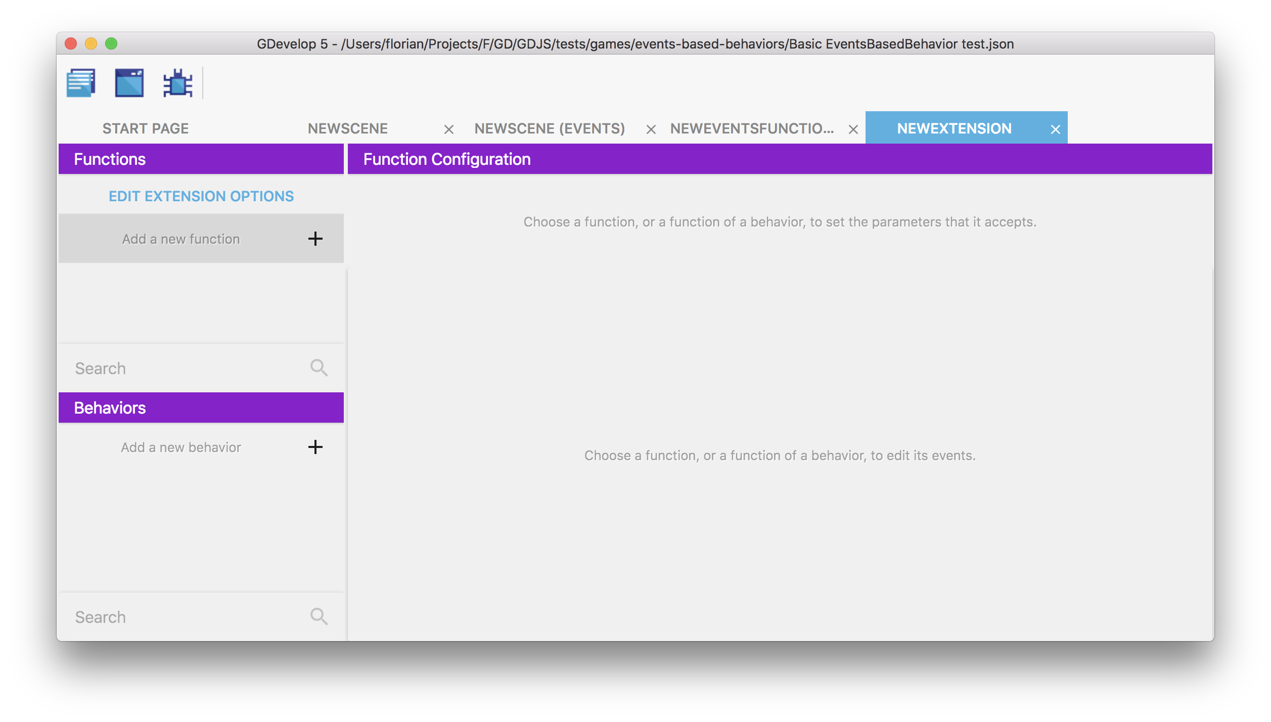 関数を登録するときに、条件、アクション、または式のいずれかを選択できます。この関数には、シーンや外部イベントと同じように、ゲーム中に条件またはアクションが起動されたときに実行されるイベントを含むことができます。