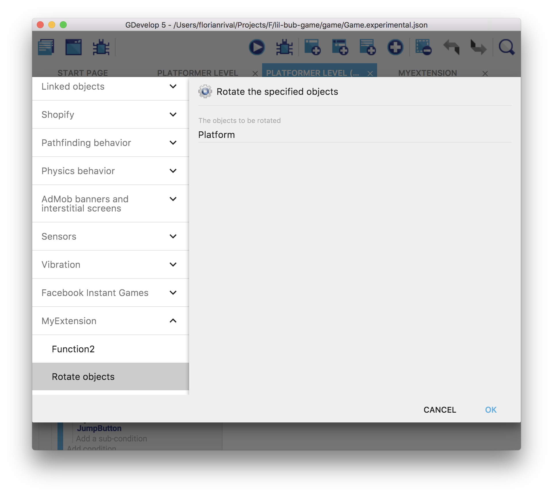 関数はプロジェクト間で共有できます(GDevelopで作成したアクションや条件と同様に)。もっとも簡単な方法は、ただコピー/ペーストすることでしょう。ただし、便利な関数群ができあがった場合は、それらをコミュニティと共有することを検討してください。