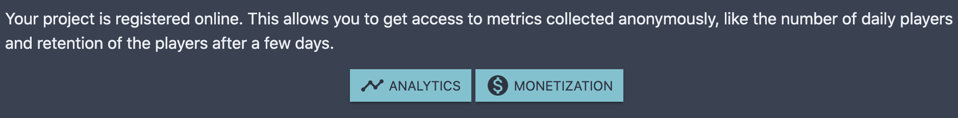 ボタンをクリックして、ゲームを登録します。エクスポート時でなくても、ファイルメニュー(デスクトップアプリの場合)かプロジェクトマネージャー(Web アプリの場合)からゲーム ダッシュボードを開けば、そこでゲームを登録できます。 登録が済めば、現在のゲーム ダッシュボードにアクセスできるようになります。