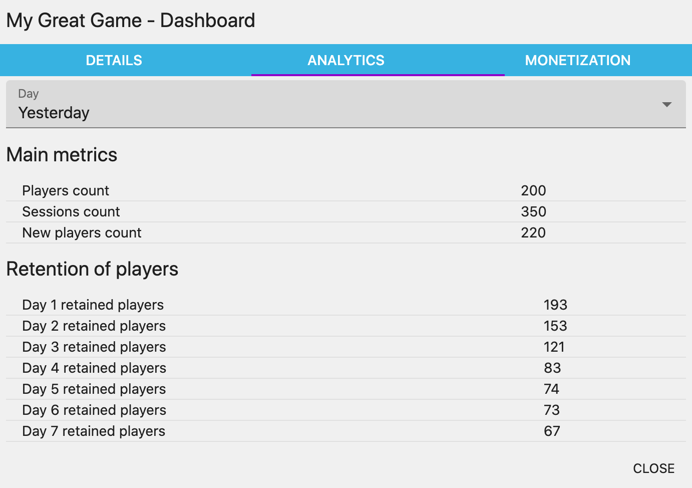 GDevelop でゲームを作るのは、ゲームを成功させる道のりの一工程にすぎません。ゲームをエクスポートして公開したあとは、どれくらいのプレイヤーがゲームをプレイして、それはどれくらいの時間で、そのうち何人がもう一度プレイしに戻ってきたかを把握することが重要になります。