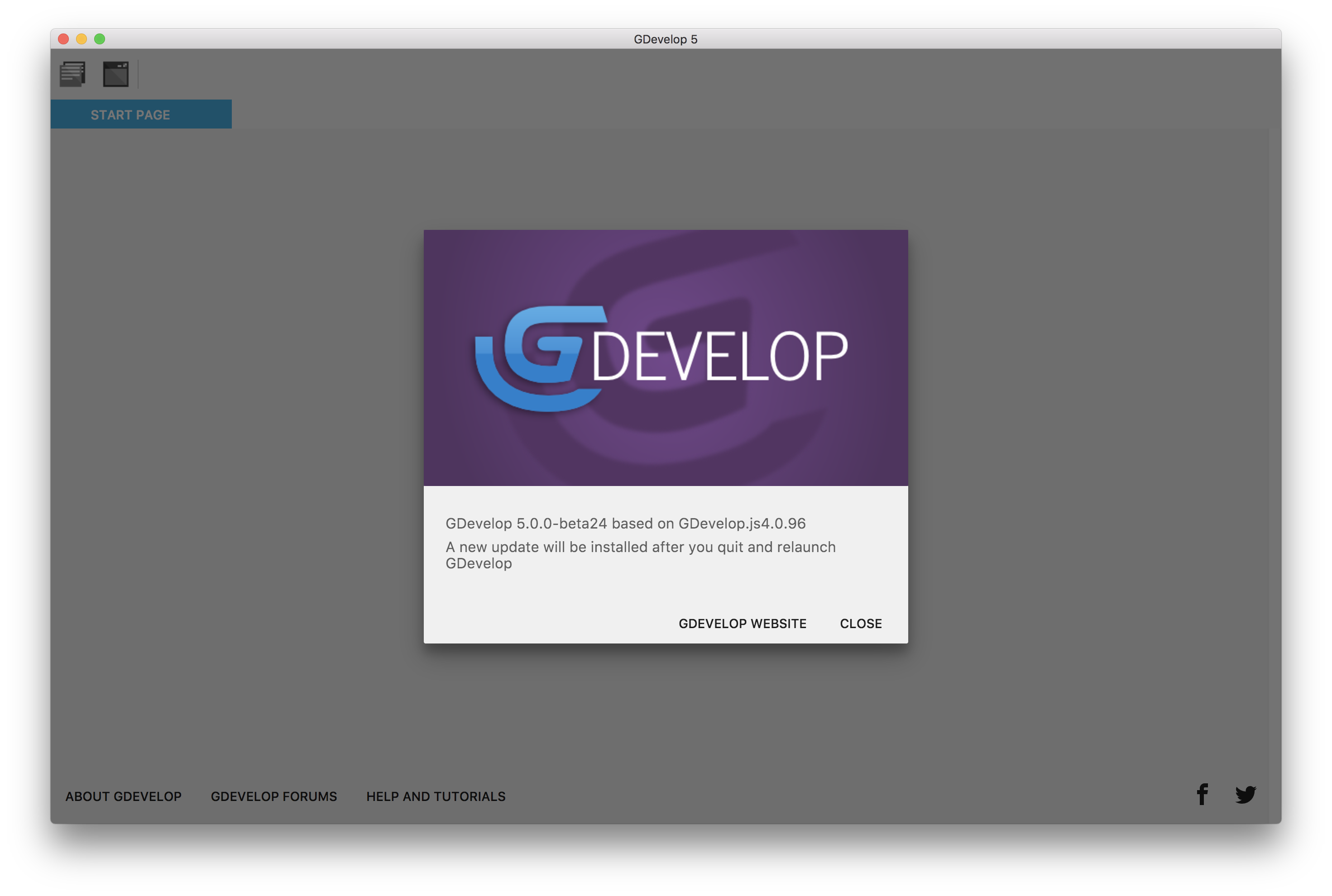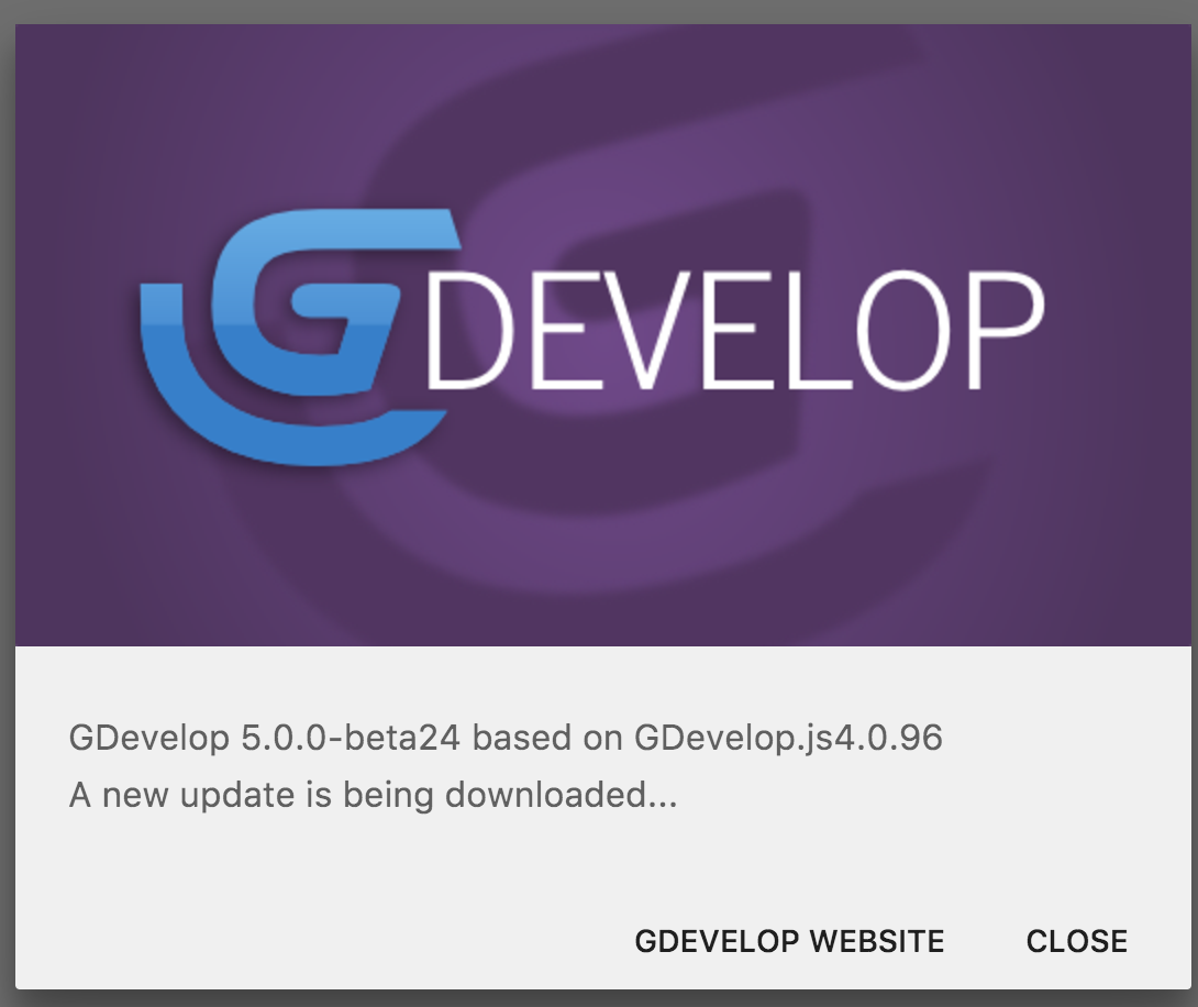 これでGDevelopを閉じます。新しいアップデートがインストールされます。バージョン情報が更新されていることを確認するには、ウィンドウをもう一度確認してください。