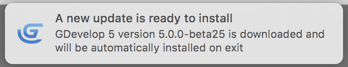 ダウンロードが完了すると、GDevelopは更新の準備ができたことを通知します