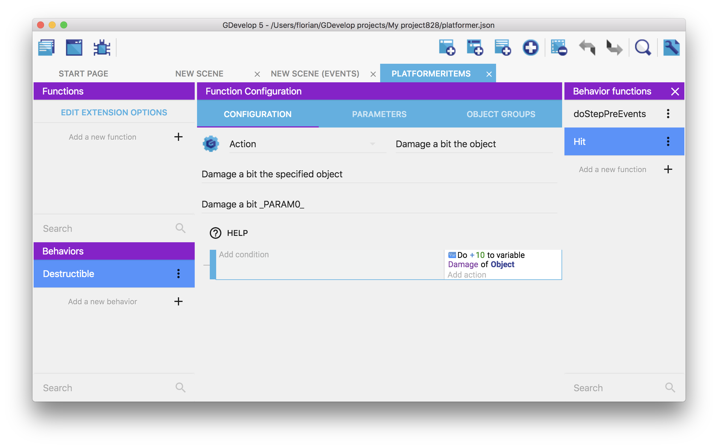 You can run the game and see that the events in "doStepPreEvents" function (or "doStepPostEvents") will be executed. In the example of the Destructible behavior that was created, if the "Damage" variable is set to a number greater or equal to 100, the object will be destroyed automatically.