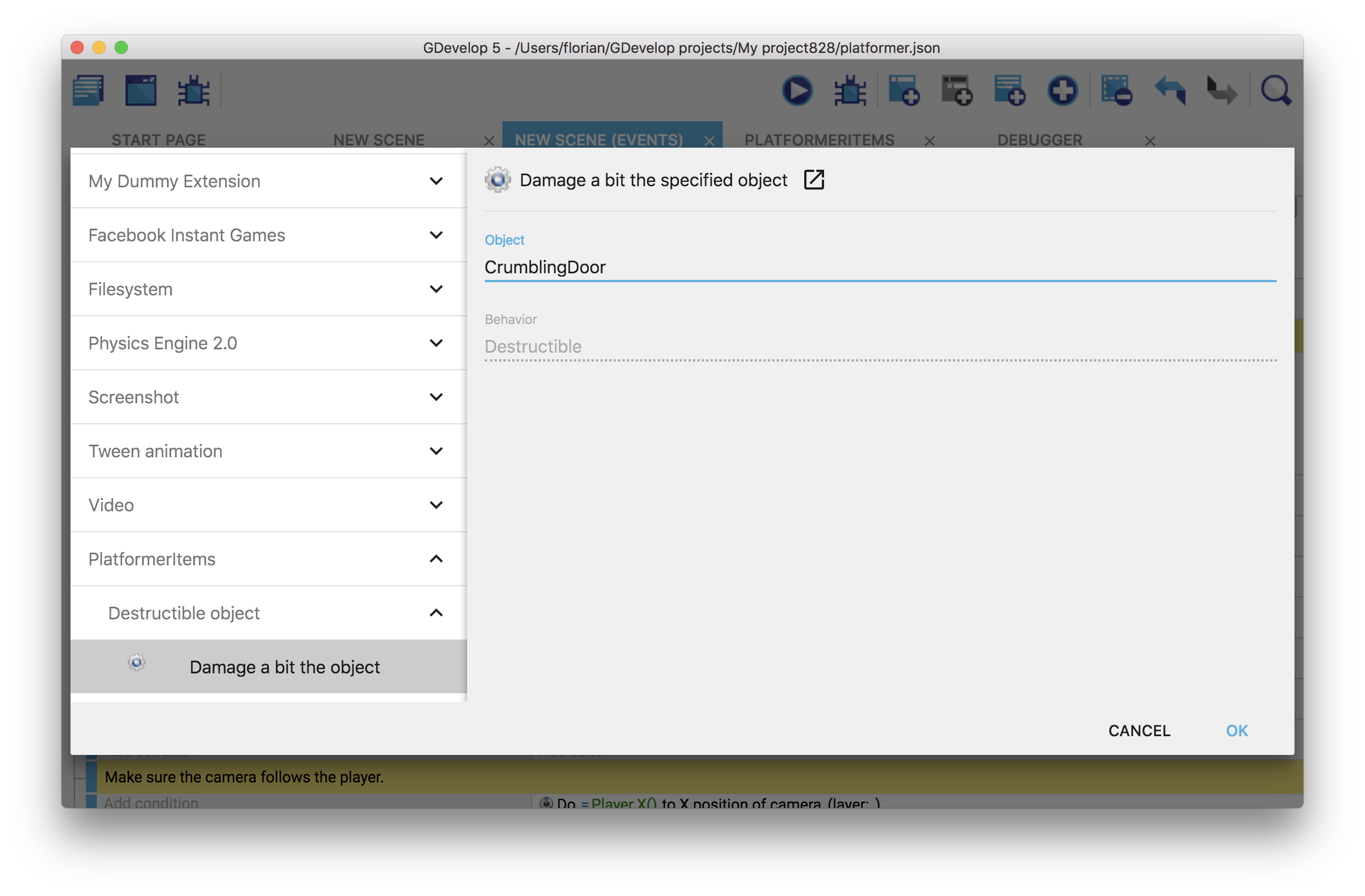 Like any other "built-in behavior", you can also use actions/conditions (or expressions) if you have declared functions as such in the behavior. For example, in the "Destructible" behavior, we created an action to cause some damage to the object. We can find it and use it in the events sheet: