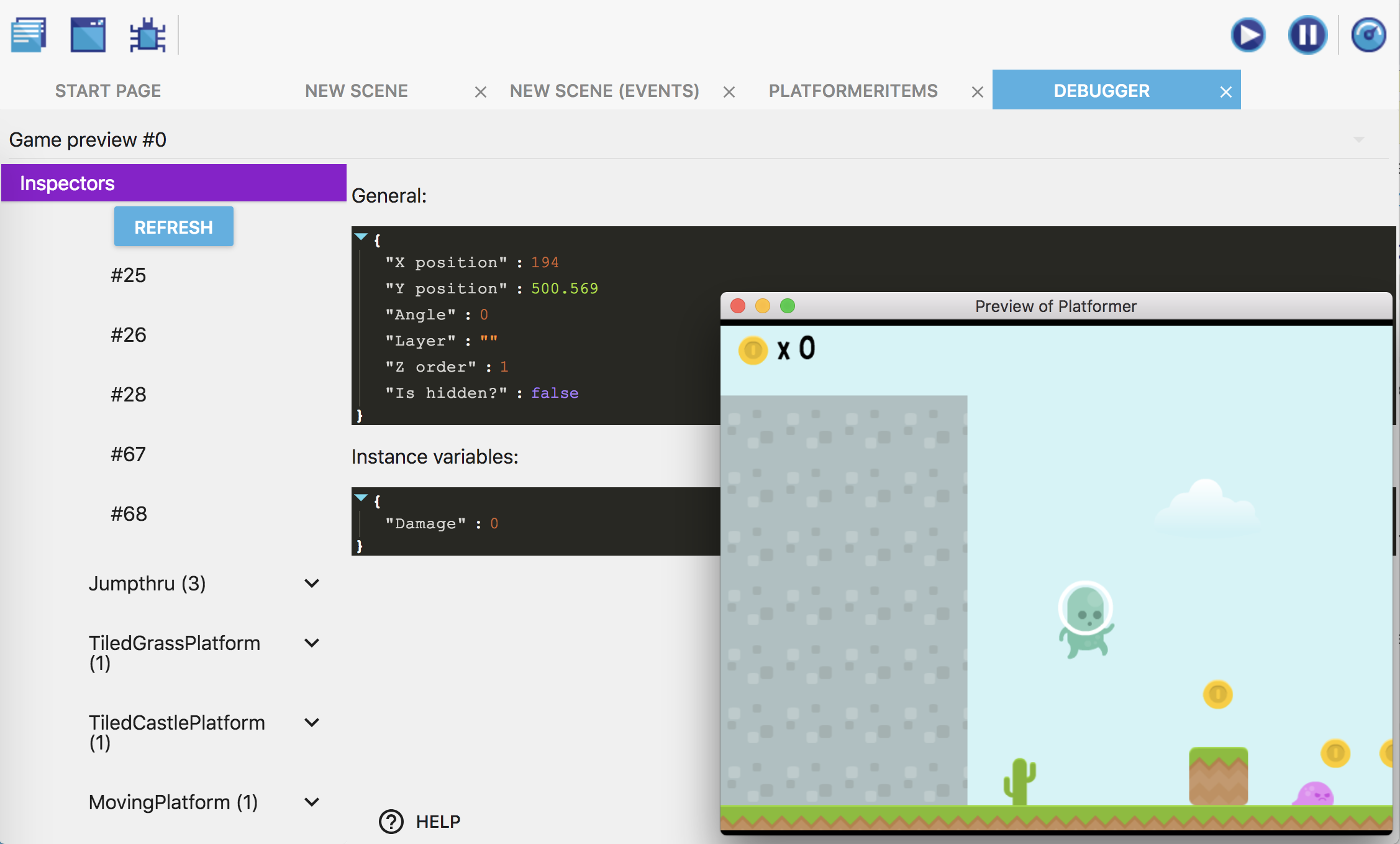 To test this, we've added the "Destructible" behavior to object "Platform". Then, when using the debugger, we can inspect "Platform" instances and see that they have a "Damage" variable (set to 0). If we use the debugger (or an event) to set it to 100, the object is removed from the scene: