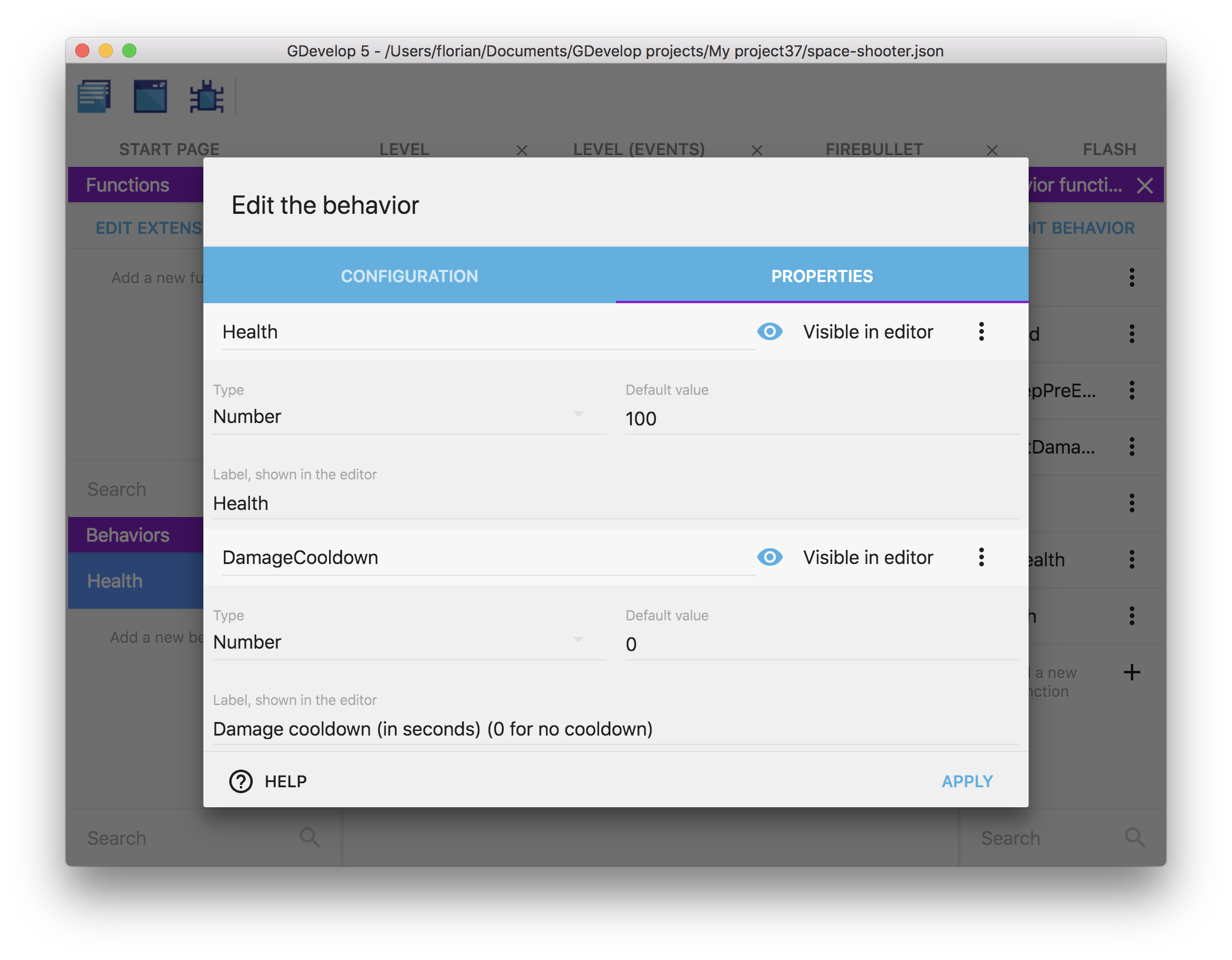 To show and add properties to your behavior, edit it and click on the "Properties" tab. In this example, you can see a behavior called "Health", that has properties to store the health of the object and the minimum time between two hits on the object: