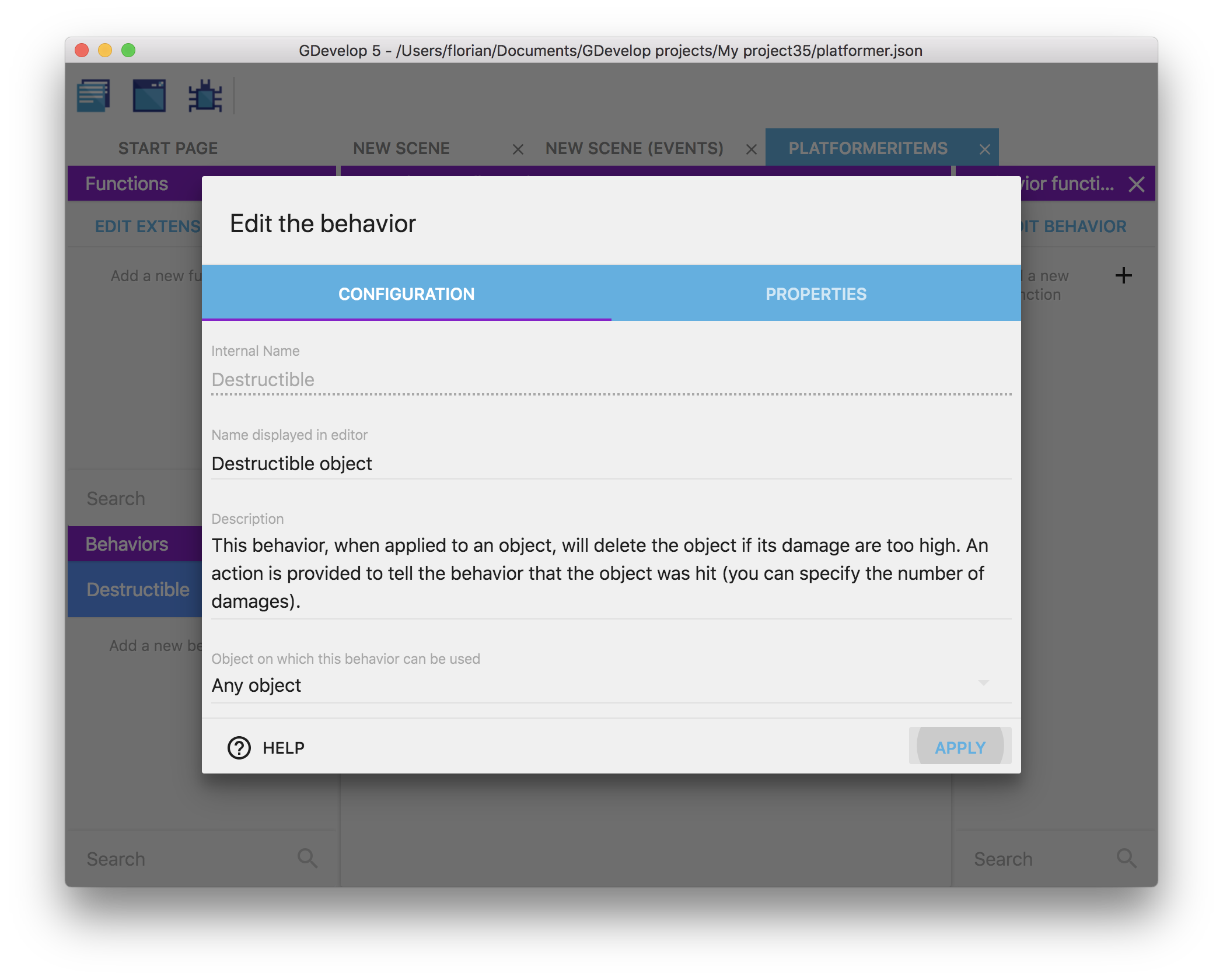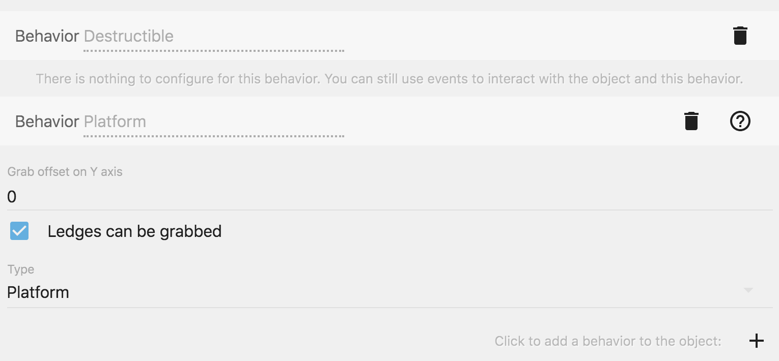 Here, you can see the "Destructible Object" behavior for example (that was created in the previous screenshots):