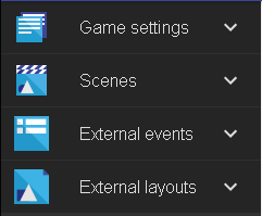Scenes (Сцены): обычно, сцены это разные уровни вашей игры, но не только они. В GDevelop все является сценами - главное меню, заставка, экран кредитов, все это сцены.