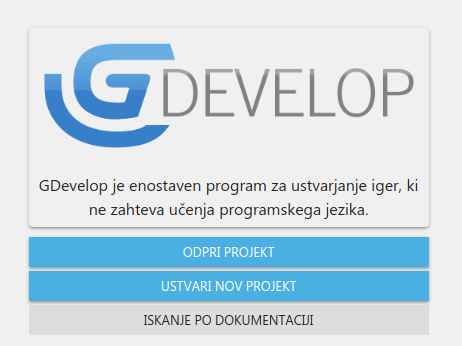 Začetna stran se prikaže, ko prvič zaženete GDevelop. Tukaj ustvarjate projekte, naložite obstoječe ali naložite vodnike.